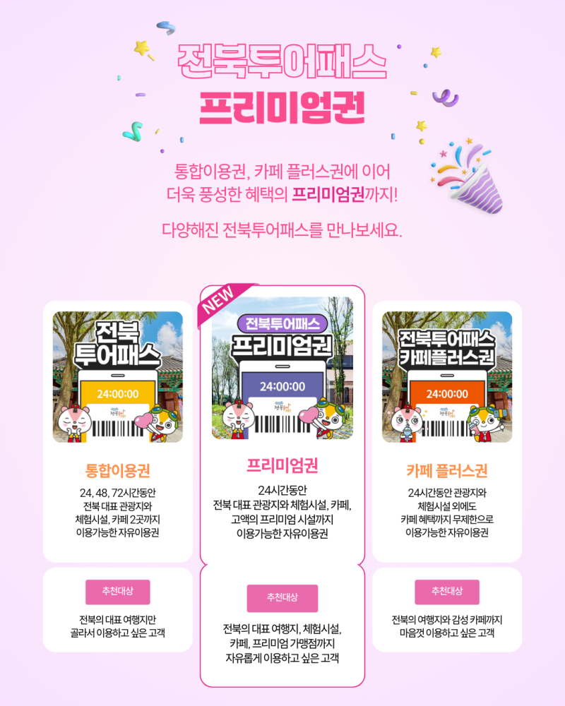 프리미엄권은 전북투어패스 전용 누리집과 스마트폰 앱을 통해 구매 및 가맹점 안내, 제휴시설 혜택 등을 확인할 수 있다. 도는 앞으로 카 쉐어링 할인 쿠폰 제공, 글로벌 OTA(온라인 여행 플랫폼)를 통한 외국인 관광객 유치 등 서비스 확대도 추진할 계획이다.