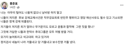 홍 전 시장은 이날 페이스북에 "니들이 저지른 후보 강제 교체 사건은 직무 강요죄로 반민주 행위고 정당 해산 사유도 될 수 있다"며 "기소되면 정계(에서) 강제 퇴출된다"고 적었다.