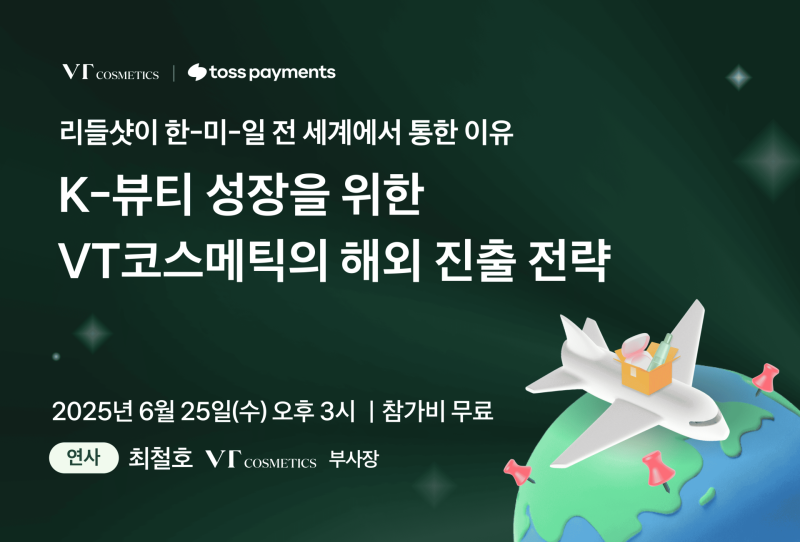 오는 25일에는 K-뷰티 브랜드 ‘VT코스메틱’의 글로벌 진출 전략을 주제로 두 번째 웨비나가 열린다. 최철호 VT코스메틱 부사장이 연사로 나서 ‘리들샷’ 성공 사례를 비롯해 한국, 일본, 미국 등 다양한 시장에서의 판매 전략과 성장 로드맵을 공유할 예정이다. 이어 황규호 토스페이먼츠 글로벌세일즈팀 리더가 국가별 현지 고객 선호 결제 시스템 도입 전략을 소개한다.