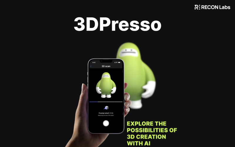 리콘랩스의 3Dpresso는 실물 객체를 스캔해 고품질 3D 에셋으로 변환하는 AI 기반 3D 창작 도구로 사용자는 스마트폰으로 360도 촬영한 비디오만 업로드하면 전문가 수준의 3D 모델을 자동 생성할 수 있으며 웹 플랫폼에서 언제 어디서나 편집과 다운로드가 가능하다.