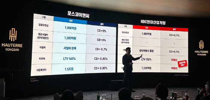 CD+0%의 입찰보증금 1000억원과 필요사업비 1000억원 그리고 조합 필수사업비 전액은 CD+0.7%, 사업촉진비 1조5000억원과 LTV 160% 보장조건이 포함된 이주비 항목도 CD+0.85%로 제시했다. 가산금리를 명확하게 못박은 조건이다. 더불어 포스코이앤씨는 1금융권 5곳과 협약을 체결해 조달 안정성도 확보했다.