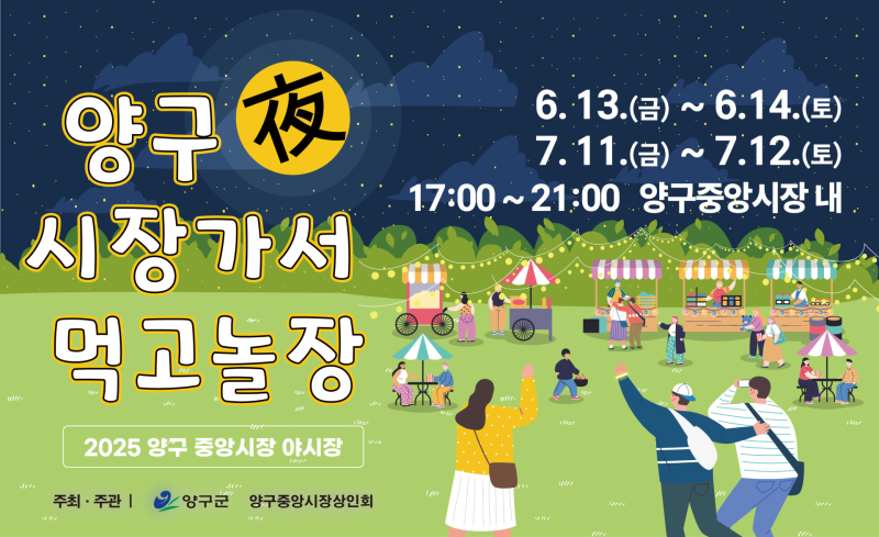 이번 야시장은 지역 주민들에게 소통과 즐거움을 제공하고, 야간 프로그램 운영을 통해 전통시장 상권을 활성화하기 위해 마련됐다. 야시장은 6월과 7월에 각각 2회씩 개최되며, 무더운 혹서기에는 잠시 휴장 후 9월에 다시 문을 연다. 행사 기간은 6월 13일~14일, 7월 11일~12일 오후 5시부터 9시까지이며, 장소는 양구중앙시장 일원이다.