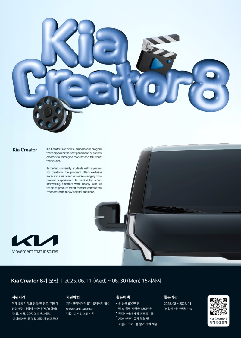 기아 크리에이터 8기는 미래 모빌리티와 영상 제작에 관심이 있는 대학생 누구나 참여할 수 있으며 8월부터 11월까지 약 4개월간 다양한 창작 활동과 브랜드 체험이 이루어질 계획이다.