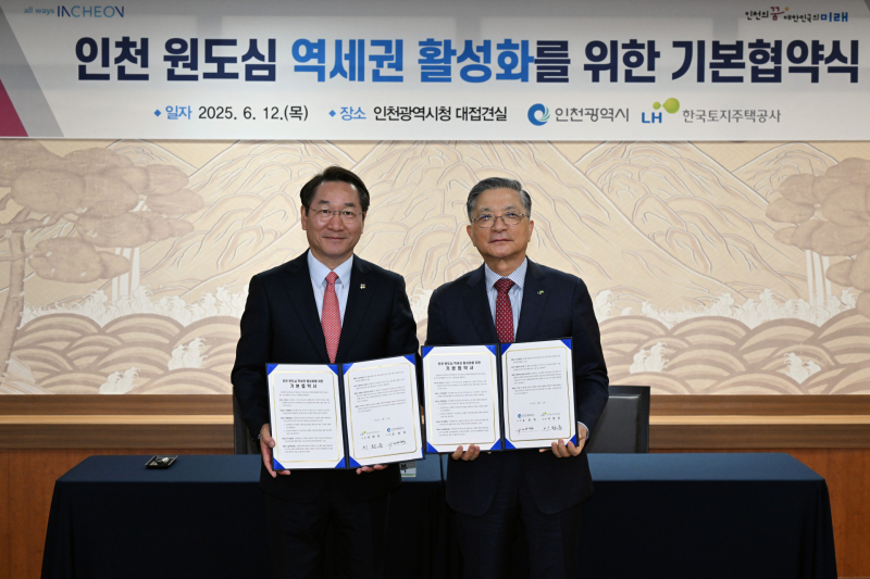 유정복 인천광역시장이 '인천 원도심 역세권 활성화를 위한 기본협약식'에서 이한준 한국토지주택공사 사장과 협약을 체결하고 있다./hyejunkim42@sedaily.com