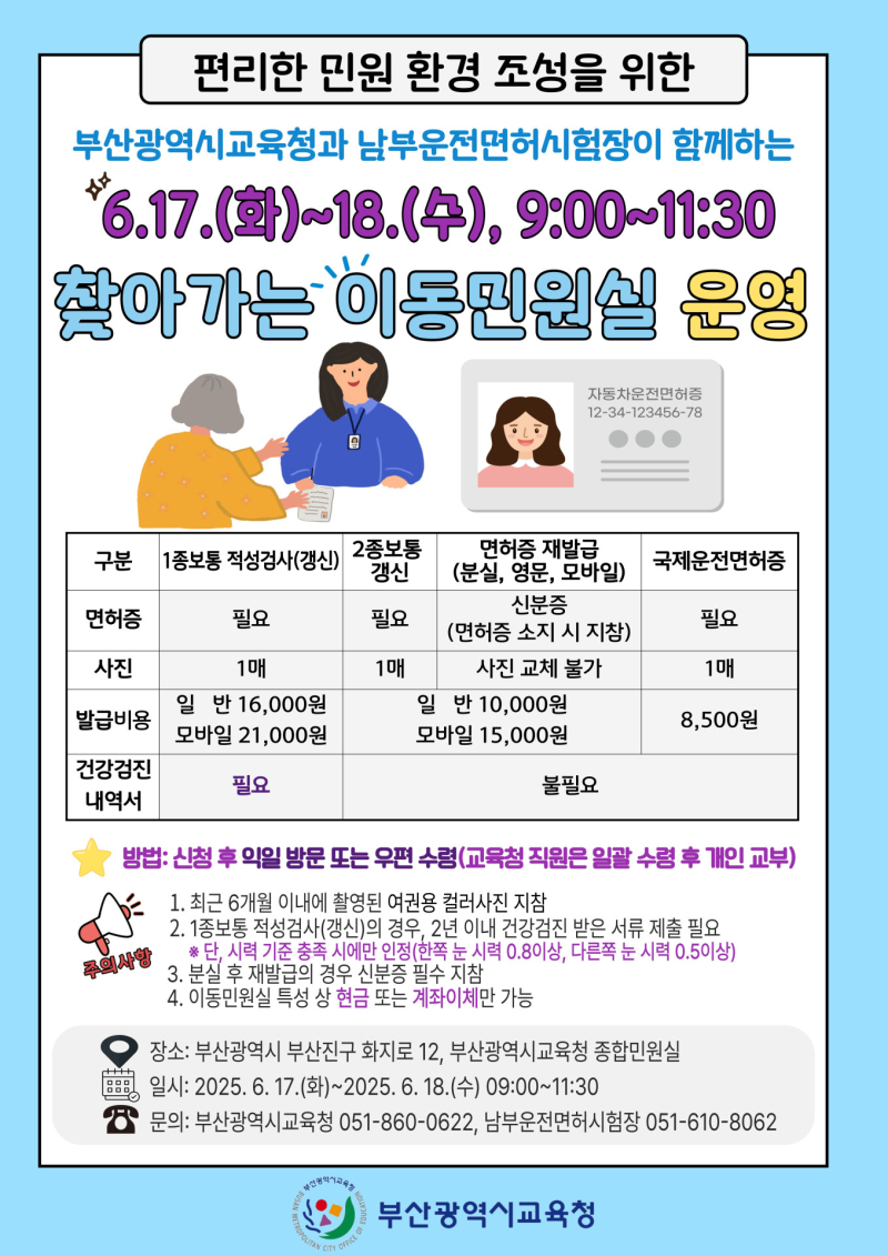[서울경제TV 부산=김정옥 기자] 부산시교육청은 오는 17일과 18일 이틀간 한국도로교통공단 남부운전면허시험장과의 협력을 통해 '찾아가는 이동민원실'을 운영한다고 16일 밝혔다.