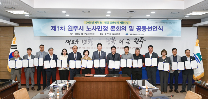 원주시 노사민정협의회는 노·사·민·정 각 주체가 모여 지역 일자리 창출 및 노사관계 안정을 최우선으로 하는 사회적 대화기구로, 위원장인 원강수 시장과 관계 전문가 15명이 본협의회 위원으로 참여하고 있다. 특히 이번 제1차 본회의에서는 시 승격 70주년을 맞이해 ‘새로운 변화, 큰 행복, 더 큰 원주’를 실천하고 경제도시로 새롭게 도약하기 위해 ‘원주시 노사민정 상생협력 공동선언문’을 채택했다.