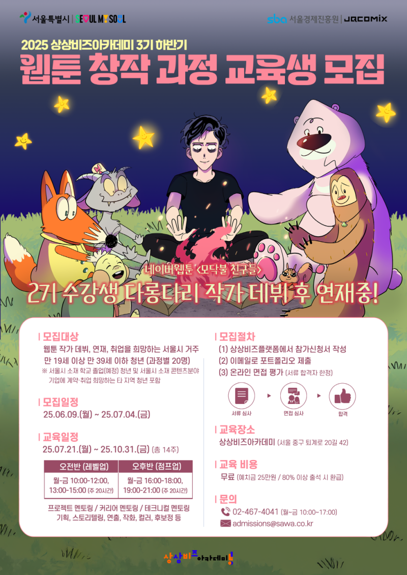 올해에는 총 7개 과정 140명 양성을 목표로 상반기에 4개 과정을 운영했고, 이번 하반기에는 3개 과정 60명의 교육생을 새롭게 모집 중이다. 8주부터 최대 14주간 현직 작가, PD가 이론부터 실습까지 맞춤형 교육과 멘토링을 진행하며, 서울시 거주 청년 가운데 웹툰과 웹소설 창작을 통해 데뷔와 연재를 희망하는 청년들은 누구나 신청 가능하다.