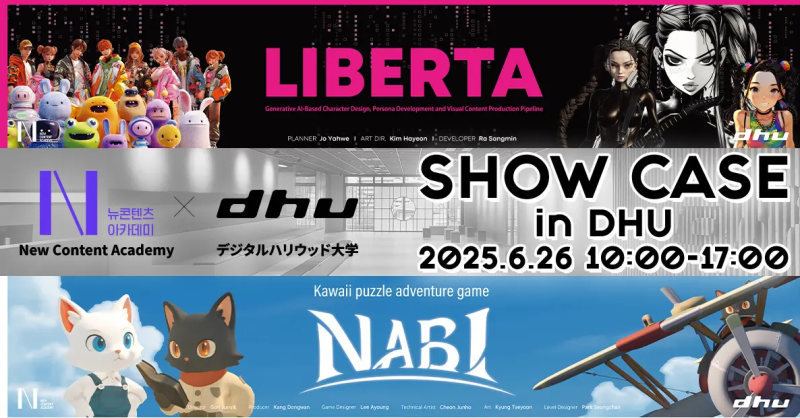 한편 26일 DHU에서 전시되는 NCA 크리에이터들의 작품은 PC용 어드벤처 게임 'NABI - 냥 비행기의 모험'과 AI제작 솔루션 'LIBERTA' 등 2개로 체험판 게임플레이 및 생성형 AI를 통한 캐릭터제작시스템 등이 소개된다.