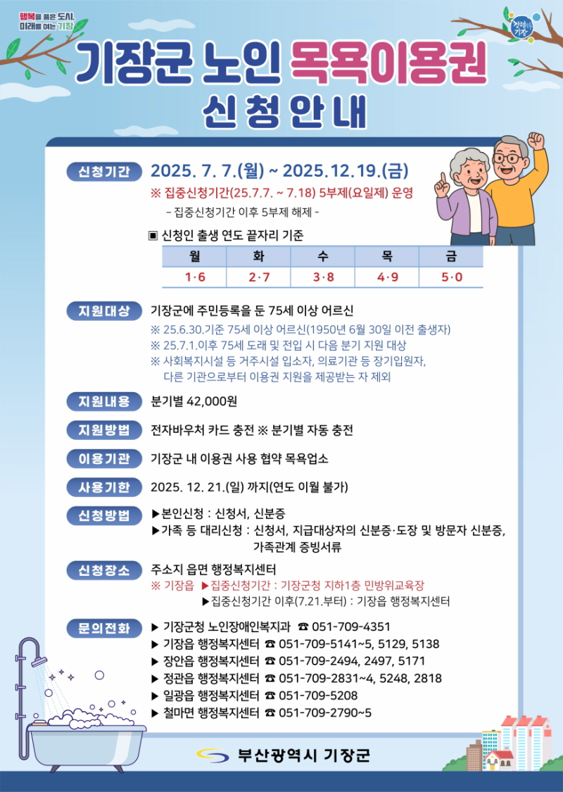 25일 기장군에 따르면 이 사업은 어르신들의 삶의 질 향상과 보건복지 증진을 도모하기 위해 마련됐으며, 지역 어르신에게 ‘목욕이용권’을 분기별로 지급하는 것을 내용으로 한다.