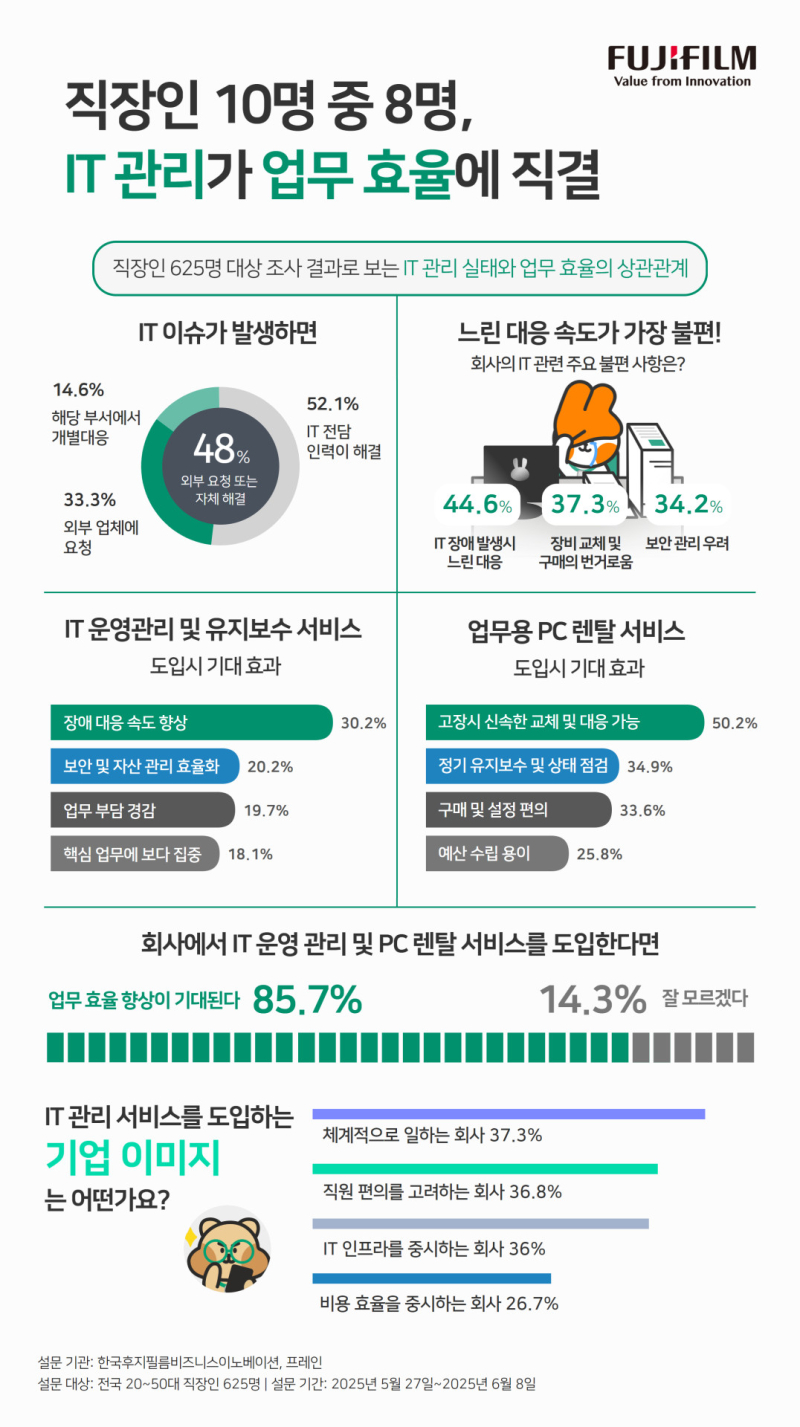[서울경제TV=진민현 인턴기자] 한국후지필름비즈니스이노베이션(한국후지필름BI)은 지난 5월 27일부터 6월 8일까지 전국 20~50대 직장인 625명을 대상으로 ‘IT 운영관리 서비스 및 업무용 PC 인식 조사’를 실시한 결과, 응답자 85.7%는 IT 통합관리 서비스가 업무 효율 향상에 도움이 될 것이라고 답했다고 26일 밝혔다.