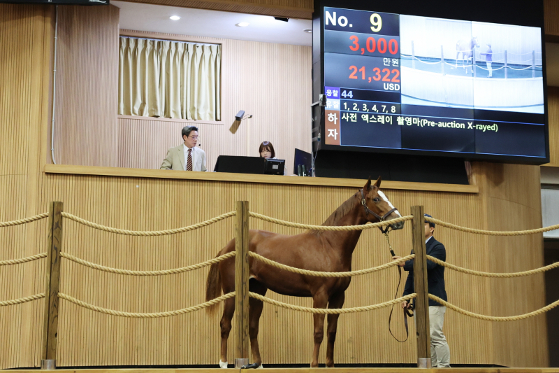 이번 경매 최고 낙찰가는 77번에 상장된 수말로 7500만원을 기록했다. 김경남 생산자가 배출한 이 수말은 한국마사회 대표 씨수말인 ‘섀클포드(부마)’와 ‘모닝뮤직(모마)’의 혈통을 이어받은 자마이다.