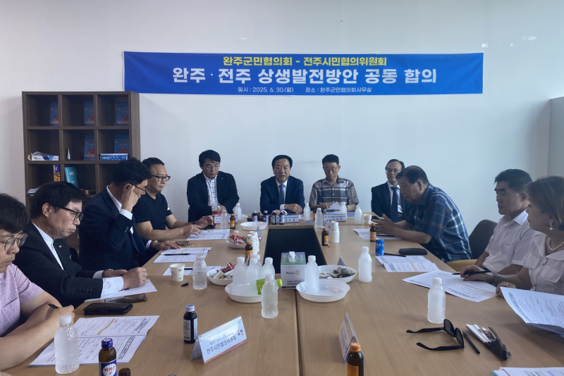 완주·전주 상생발전 완주군민협의회와 전주시민협의위원회는 30일 완주군 삼례읍 군민협의회 사무실에서 회의를 열고, 상생발전방안에 대해 최종 합의했다. 이날 회의에는 양 협의회의 위원장 및 각 분과위원장이 참석했다.