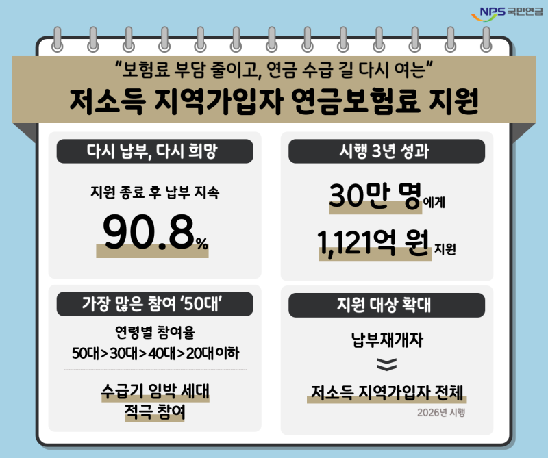 한편 지난 4월 국민연금법 개정으로 오는 2026년 1월부터는 보험료 납부 재개자뿐 아니라 일정 기준을 충족하는 저소득 지역가입자 전반으로 지원 대상이 확대될 예정이다. 구체적인 기준은 보건복지부 고시를 통해 정해진다.