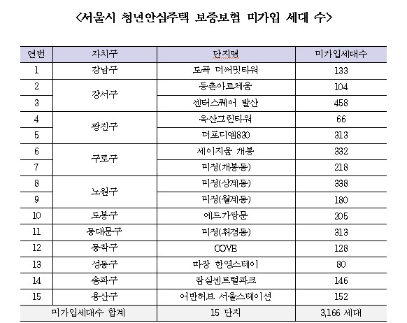 5일 국회 기획재정위원회 소속 차규근 조국혁신당 의원이 서울특별시로부터 제출받은 자료에 따르면 서울 청년안심주택 중 임대보증보험에 가입하지 않은 15개 단지 중 두 곳(잠실 센트럴 파크, 옥산 그린타워) 은 이미 경매에 넘어갔다.