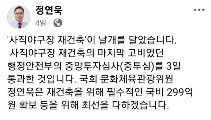국회 문화체육관광위원회 소속 정연욱 국민의힘 의원(부산 수영구)은 사직야구장 재건축에 필요한 국비 299억원 확보를 위해 최선을 다하겠다는 입장을 밝혔다.