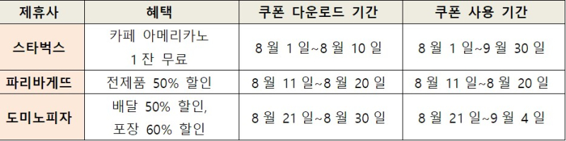 이어 8월 11일∼20일까지는 파리바게뜨 전 제품에 대해 최대 1만원까지 50% 할인 쿠폰을 제공한다.