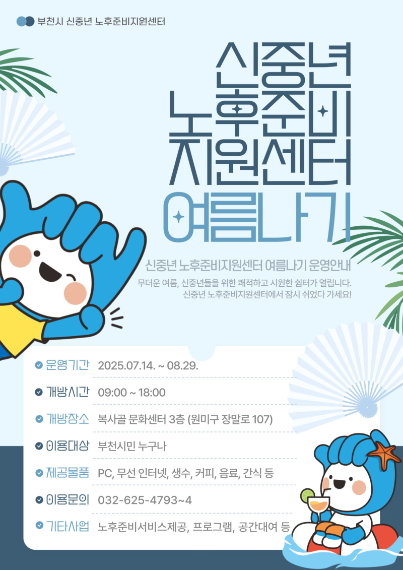[서울경제TV 인천=김혜준 기자] 부천시가 여름철 폭염에 대응해 ‘신중년노후준비지원센터’를 시민 휴식 공간으로 무료 개방합니다.