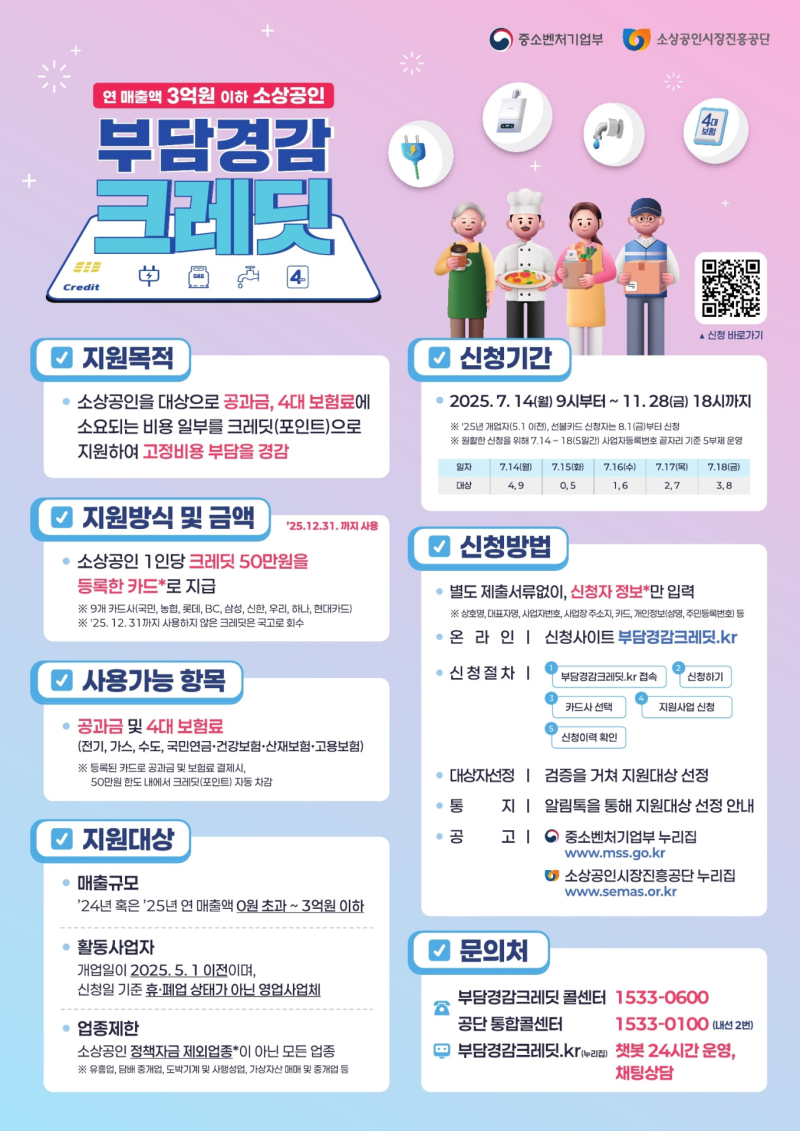 신청은 14일 오전 9시부터 28일 오후 6시까지 부담경감크레딧 누리집에서 가능하며, 접수 초기 혼잡을 방지하기 위해 14일부터 18일까지는 사업자등록번호 끝자리 기준 5부제를 운영한다.