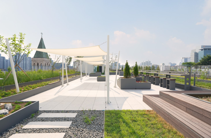 옥상은 잔디 뜨락과 차양막, 나무 데크, 개별 썬배드가 있는 정원으로 조성돼 있다. 주차장은 전면 자주식 구조로, 150대 전 차량이 빠르게 입출차할 수 있도록 설계됐다.