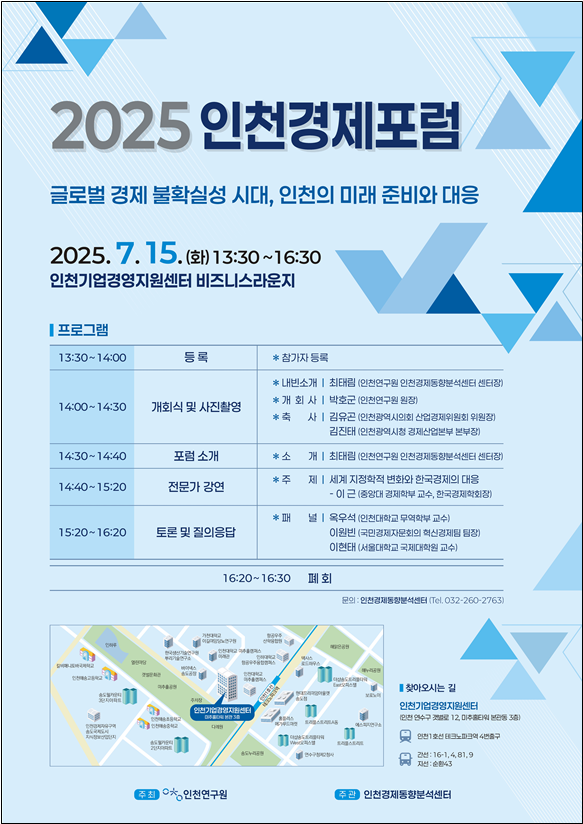 연구원에 따르면, 인천연구원이 7월 15일 오후 2시 인천기업경영지원센터에서 ‘글로벌 경제 불확실성 시대, 인천의 미래 준비와 대응’을 주제로 2025 인천경제포럼을 개최한다고 전했다.