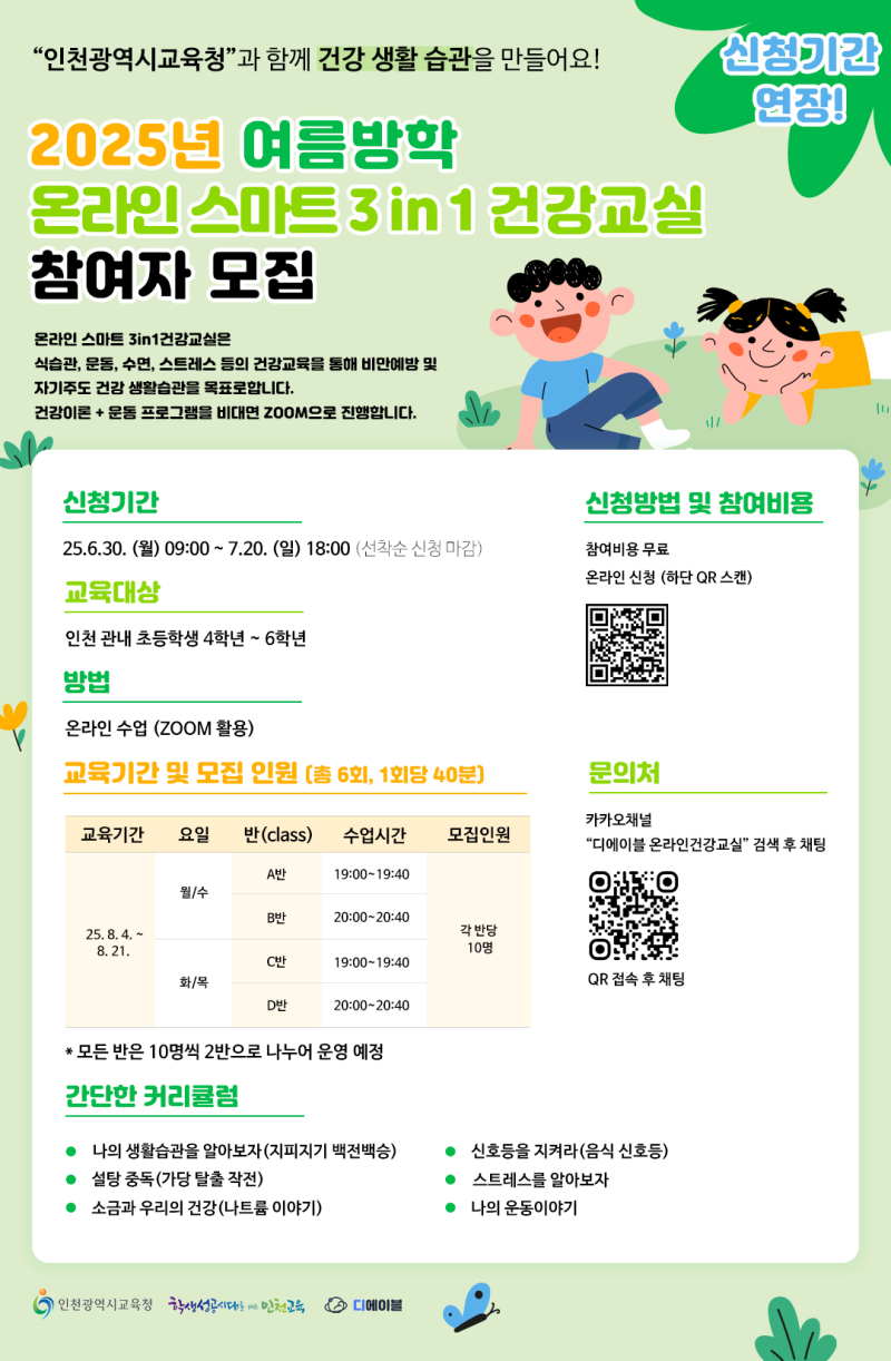 [서울경제TV 인천=김혜준 기자] 인천시교육청이 여름방학 동안 초등 4~6학년 학생을 대상으로 ‘온라인 스마트 3in1 건강교실’을 운영합니다.