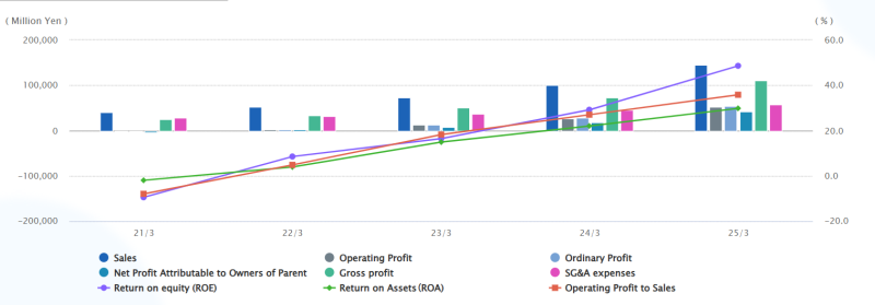 18일 산리오의 IR 자료에 따르면, 산리오의 매출은 2025년 회계연도(2024년4월~2025년3월) 매출은 전년대비(999억엔, 한화 약 8991억원) 45% 증가한 1449억엔 (한화 약 1조 3041억원)을 달성했다. 산리오의 2023년 회계연도 (2022년 4월~2023년 3월) 매출은 726억엔 (한화 약 6534억 원)에 불과했다.