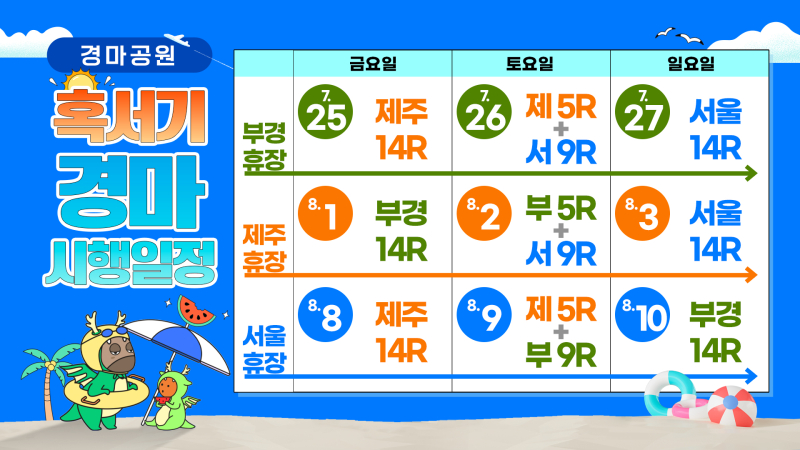 휴장 첫 주자인 렛츠런파크 부경은 7월 마지막주 숨고르기에 들어간다. 이후 8월 첫째 주에는 제주, 둘째 주에는 서울이 휴장에 들어간다. 해당 기간 중 중계 발매는 진행되므로 고객 입장이 가능하며 ‘더비온’을 통해 온라인 마권구매도 가능하다.