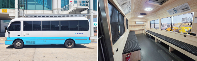 한국공항이 자체 설치한 휴게시설은 컨테이너를 활용한 고정식 4개소와 지상조업 업무 특성상 근무 중 이동이 많은 직원들을 배려해 마련된 이동식 버스형 8대다. 내부에는 냉난방기, 테이블, 정수기 및 의자 등 휴식에 필요한 기본시설이 갖춰져 있다. 특히 버스 형태의 이동식 휴게시설에는 태양광 전력을 이용하는 무시동 냉난방기를 달아 자체 전력을 쓰도록 해 에너지 효율성과 ESG 경영 실천도 고려했다.