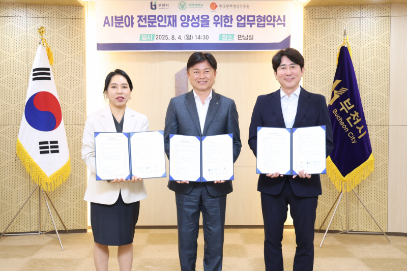 [서울경제TV 인천=김혜준 기자] 부천시가 유한대학교, 한국만화영상진흥원과 함께 ‘AI 만화‧영상 부트캠프’ 운영을 위한 업무협약을 체결했다.