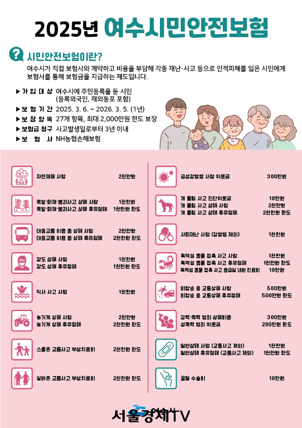 특히 ‘시민안전보험’은 여수시민 전체가 별도 절차 없이 자동 가입되어 각종 사고나 재난 발생 시 실질적인 보장을 받을 수 있도록 운영된다. 시는 보장내용을 집중 홍보하고 사고 발생 시 신속한 안내로 실질적인 수혜율도 높이고 있다.