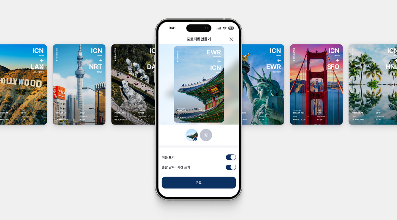 포토티켓은 모바일탑승권을 발급받은 고객이 자신의 여정 정보를 담아 이미지 형태의 티켓을 만드는 서비스다. 노선, 출발일, 탑승편 등이 자동 입력되며, 여행자가 직접 선택한 사진을 덧붙여 저장하거나 공유할 수 있다. 모바일 앱과 웹사이트 양쪽에서 모두 이용할 수 있어 언제 어디서든 간편하게 제작할 수 있다.