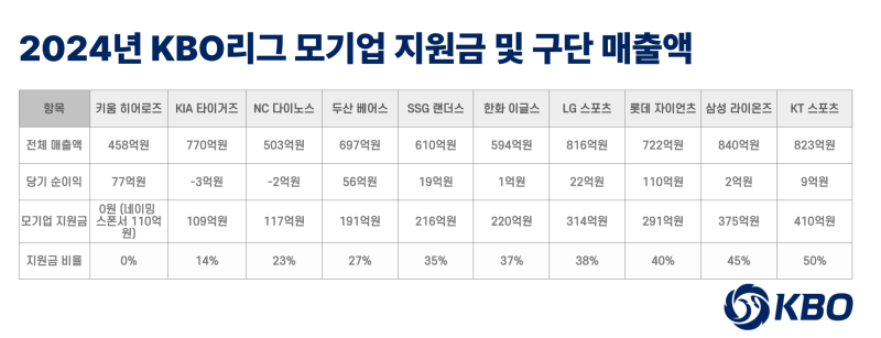 지난해 10개 구단 중 키움을 제외한 9개 구단이 적자를 기록했으며, 매년 '특수관계자 매출'이란 명목의 지원금을 모기업으로 받으며 운영을 이어갔다.