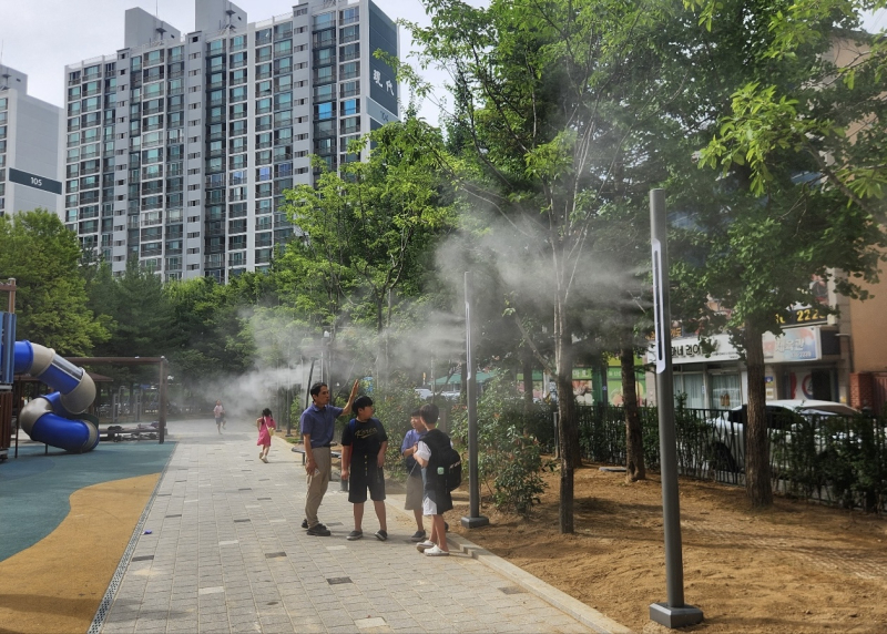 설치된 쿨링포그는 정수 처리된 수돗물을 미세한 물안개 형태로 분사해 주변 체감온도를 약 3~5℃ 낮추는 친환경 시설로, 미세먼지 저감 효과도 함께 기대된다.