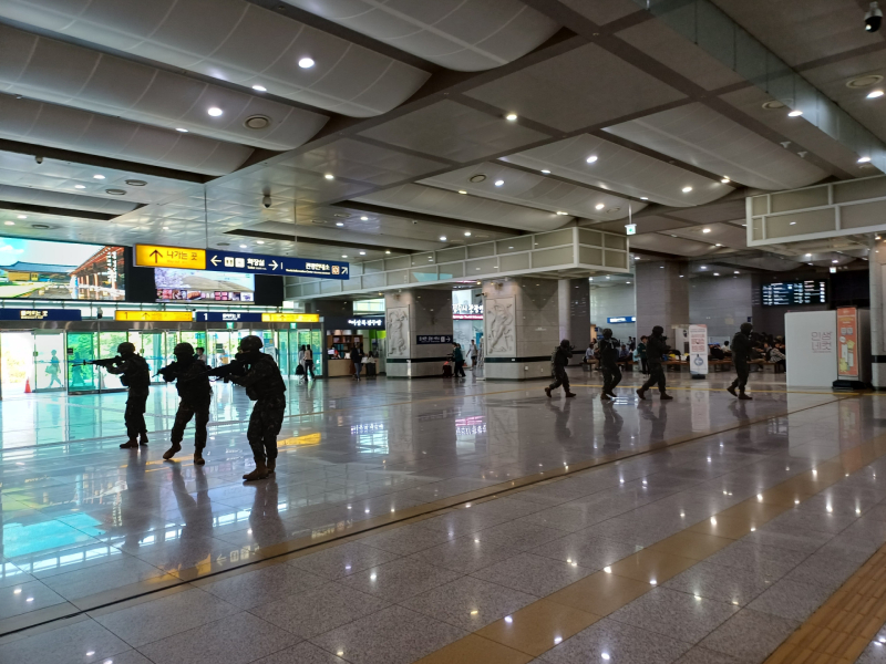 훈련은 적 테러범 2명이 경주역에 침투해 폭발물을 터뜨리고 화학물질을 살포해 건물이 파괴되고 다수의 사상자가 발생한 상황을 가정해 단계별로 전개됐다.