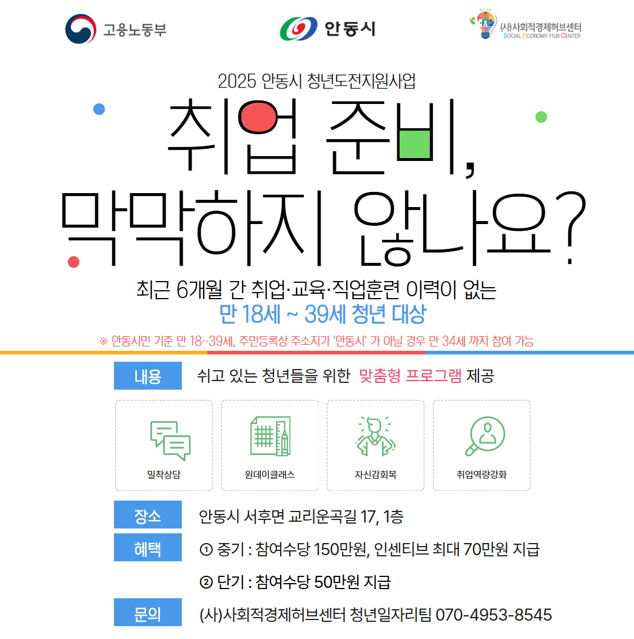 청년도전지원사업은 만 18세에서 39세 이하의 안동시 거주 청년 중 최근 6개월 이상 취업․교육․훈련에 참여하지 않은 이른바 ‘NEET’ 청년을 대상으로 한다. 참여 청년에게는 심리상담, 동기부여, 직업역량 강화 프로그램 등 종합적인 지원이 제공된다.