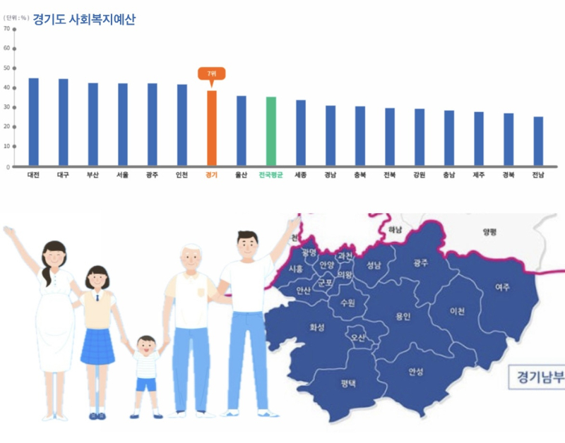 경기도는 규모가 큰만큼 사회복지 예산액도 전체예산의 절반 가까이 차지할만큼 비중이 높은 편입니다. 사회복지분야 예산은 전국 평균보다도 높은 수준입니다.