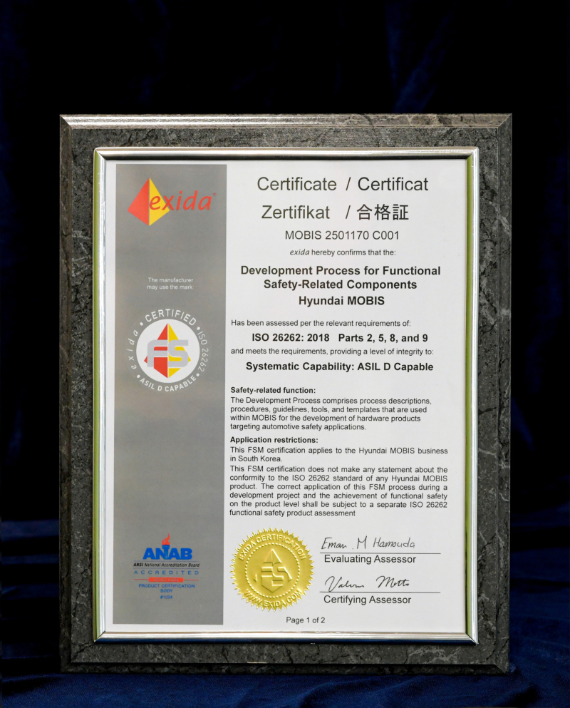 특히, 현대모비스는 ISO 26262 인증을 위한 차량 안전 무결성 기준(ASIL: Automotive Safety Integrity Level)에서 난이도가 가장 높은 D등급을 받았다. ASIL은 A부터 D까지 총 4단계로 나뉘며, D등급은 99% 이상의 엄격한 신뢰도로 안전사고를 예방할 수 있는 최고 등급이다.