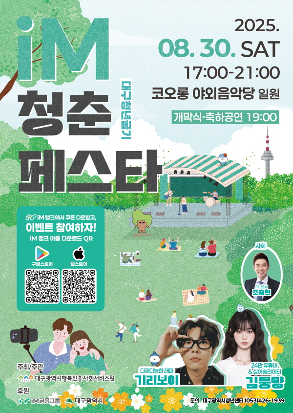 [서울경제TV 대구=김정희 기자] 대구광역시행복진흥사회서비스원(이사장 배기철, 이하 대구행복진흥원)은 오는 8월 30일 오후 7시, 코오롱야외음악당에서 ‘2025 iM 청춘페스타’를 개최한다.