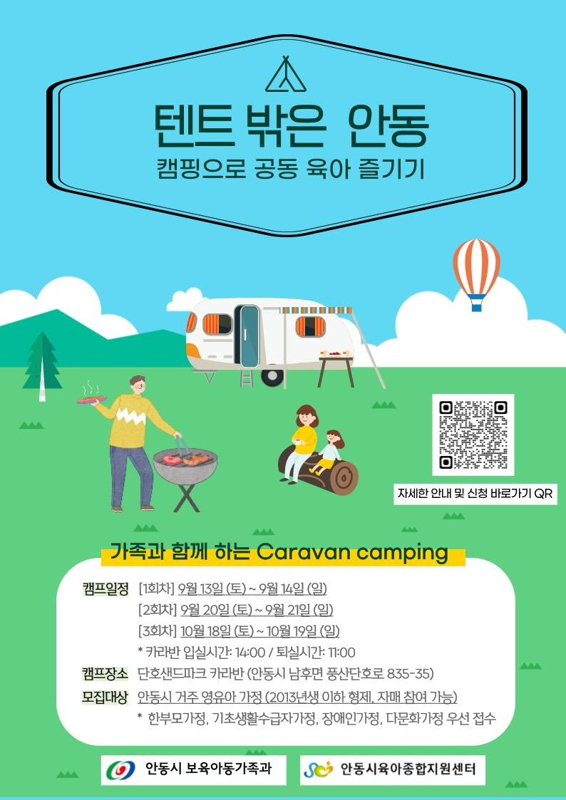[서울경제TV 안동=김아연 기자] 안동시는 안동시육아종합지원센터와 함께 오는 9월과 10월 단호샌드파크에서 안동시 거주 영유아 가정을 대상으로 ‘텐트 밖은 안동, 캠핑으로 공동육아 즐기기’ 캠핑 프로그램을 운영한다.