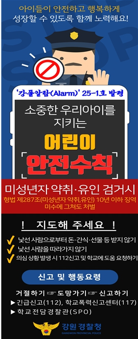 경찰은 최근 초등학교 주변에서 하교하는 학생들에게 접근하여 납치·유괴 등 범죄를 시도하는 사건이 지속적으로 발생하고 있어 등하굣길 아동 대상 범죄 차단 및 안전한 통학환경 조성을 위해 강폴알람(Alarm) 제25-1호 어린이 안전수칙을 발령한 것이다.