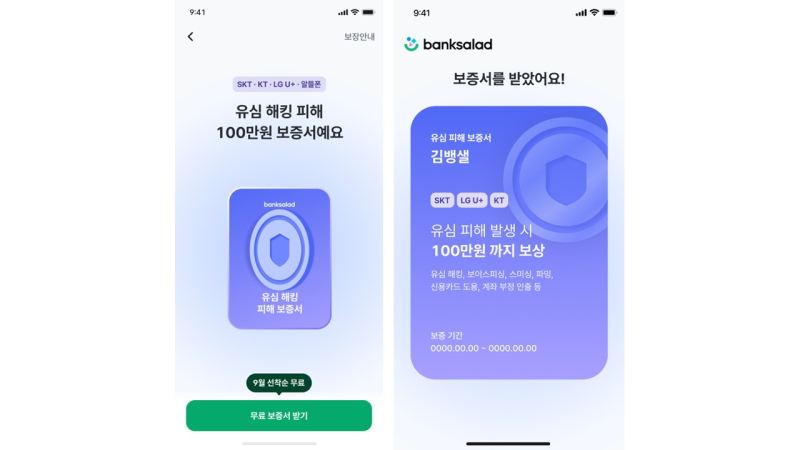 전화, 문자, 스미싱, 메모리 해킹 등으로 인해 본인 명의 계좌에서 부당 인출되거나 카드가 부정 사용돼 금전적 피해가 발생한 경우 최대 100만 원까지 보상받을 수 있다. 뱅크샐러드 유저라면 누구나 무료로 받을 수 있으며, 별도의 유료 전환 없이 1년간 무상 보장이 제공된다. 단, 보증서 신청은 선착순으로 마감될 수 있다.