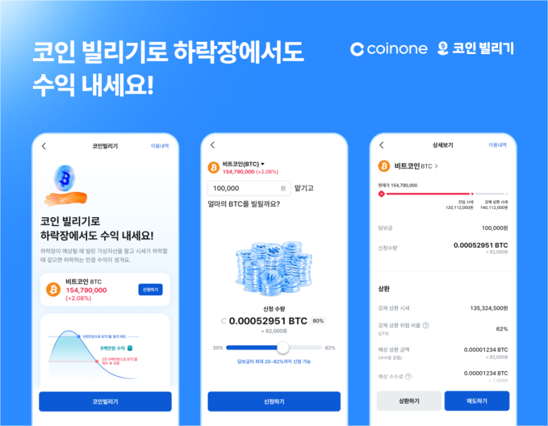 코인 빌리기는 고객이 보유한 원화를 담보로 가상자산을 대여할 수 있는 서비스다. 최소 담보금 5만 원부터 담보금의 82%까지 가상자산을 대여할 수 있으며, 인당 3000만 원 한도 내에서 1회 대여가 가능하다. 대여 신청부터 상환까지 전 과정이 자동화돼 있어 365일 24시간 이용할 수 있다.