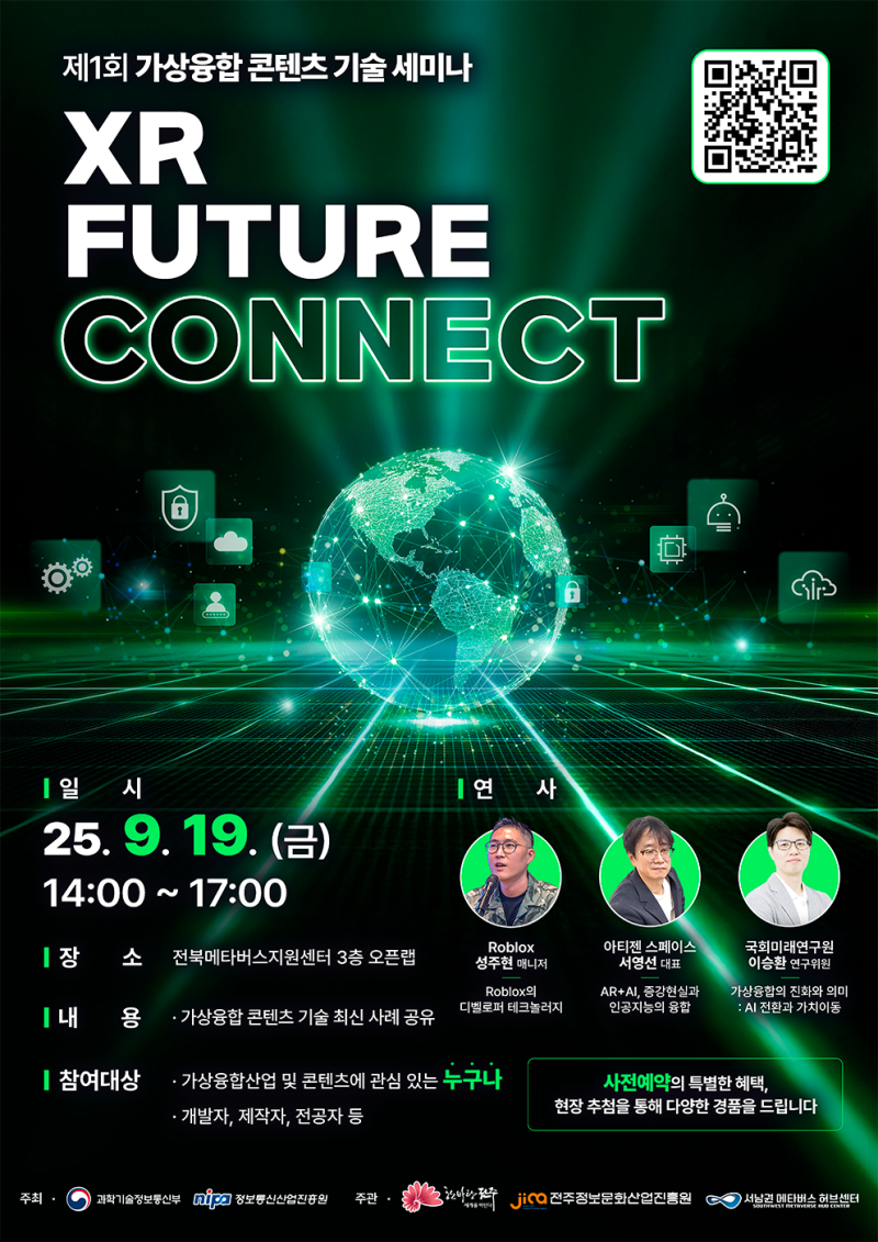 과학기술정보통신부와 정보통신산업진흥원이 주최하고, 전주시와 서남권 메타버스허브센터가 주관하는 제1회 가상융합 콘텐츠 기술 세미나 ‘XR Future Connect’가 오는 19일 금요일 오후 2시, 전북메타버스지원센터 3층 행사장에서 개최된다.