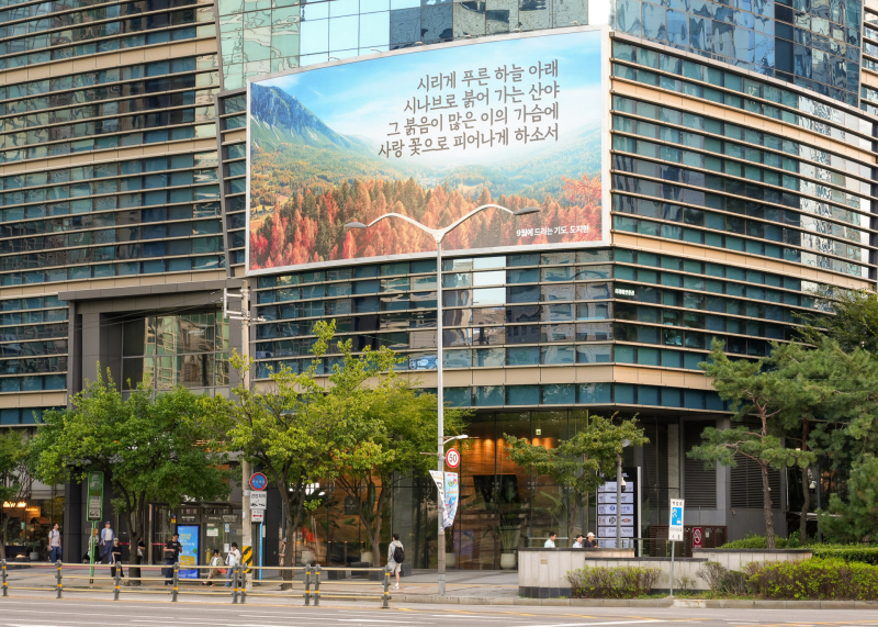 이번 글판에는 도지현 시인의 시 ‘9월에 드리는 기도’의 일부 구절이 담겼다. S-OIL은 “모르는 사이 조금씩 물든 단풍처럼 공덕오거리를 오가는 시민들의 일상에도 사랑이 시나브로 피어나길 바란다”고 전했다.