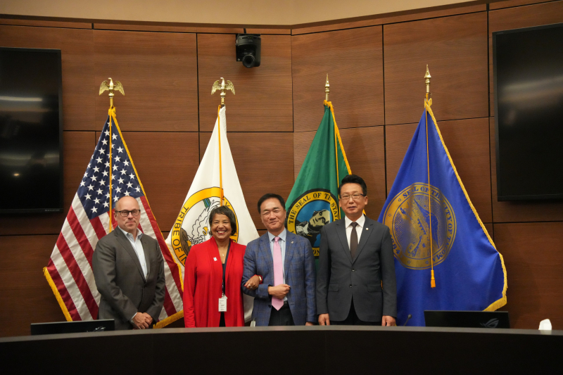 정장선 시장과 강정구 평택시의회 의장은 타코마시청을 찾아 빅토리아 우더즈 타코마 시장을 만났습니다. 이어 최근 체결된 애니 라이트 스쿨과의 국제학교 설립 MOU를 계기로, 교육 협력을 넘어 문화·경제·물류 등 도시 전반에 걸친 협력 기반을 마련하자는 데 의견을 모았습니다.