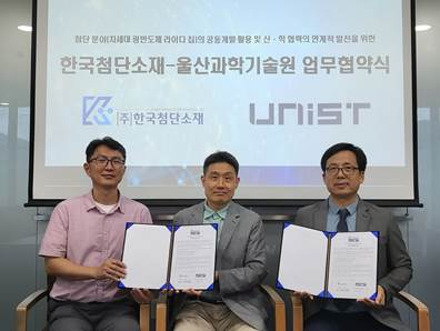 양측은 지난25일 업무협약(MOU)을 체결했다. 협약식에는 UNIST 전기전자공학과의 정일석 교수와 김진국 학과장, 한국첨단소재의 문형명 연구소장 등이 참석했다.