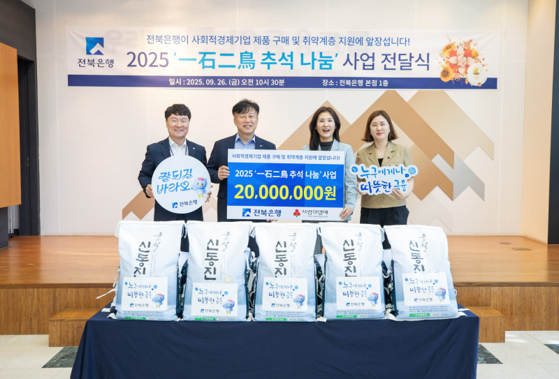 [서울경제TV=강지영 인턴기자] JB금융그룹 전북은행은 26일 전북은행 본점 1층 로비에서 2025 ‘一石二鳥 추석 나눔’ 사업 전달식을 실시했다고 밝혔다.