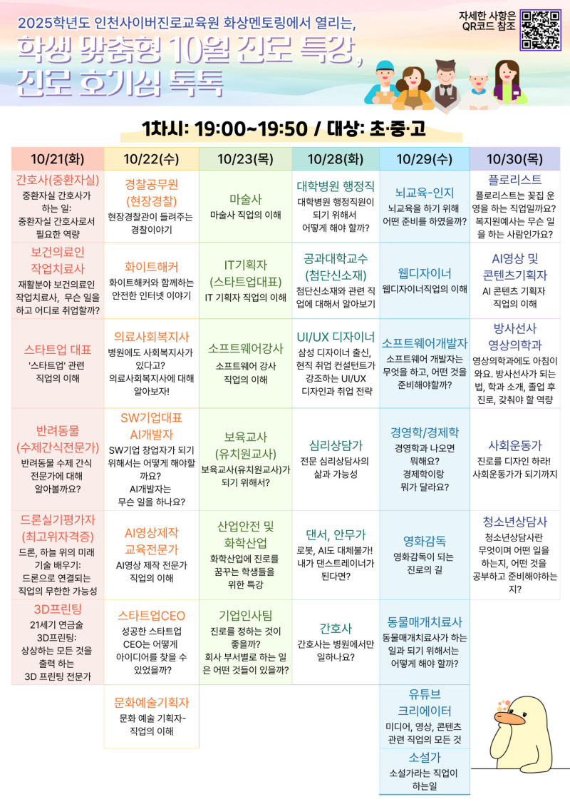 이번 특강은 10월 21일부터 30일까지 매주 화·수·목요일, 인천사이버진로교육원 온라인 화상 시스템을 통해 진행되며, 오후 7시와 8시 두 차시로 구성된다.