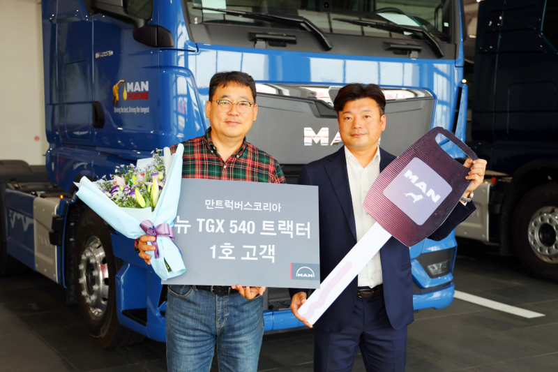 만트럭은 지난 29일 경기도 평택에 위치한 만트럭버스코리아 PDI센터에서 뉴 MAN TGX 540마력 트랙터 1호차 인도식을 진행했다. 1호차를 인도 받은 주인공은 환적화물 운송업에 종사하는 임윤건 ES물류 사장으로, 현재까지 총 4대의 MAN 트랙터를 직접 운용해왔다.