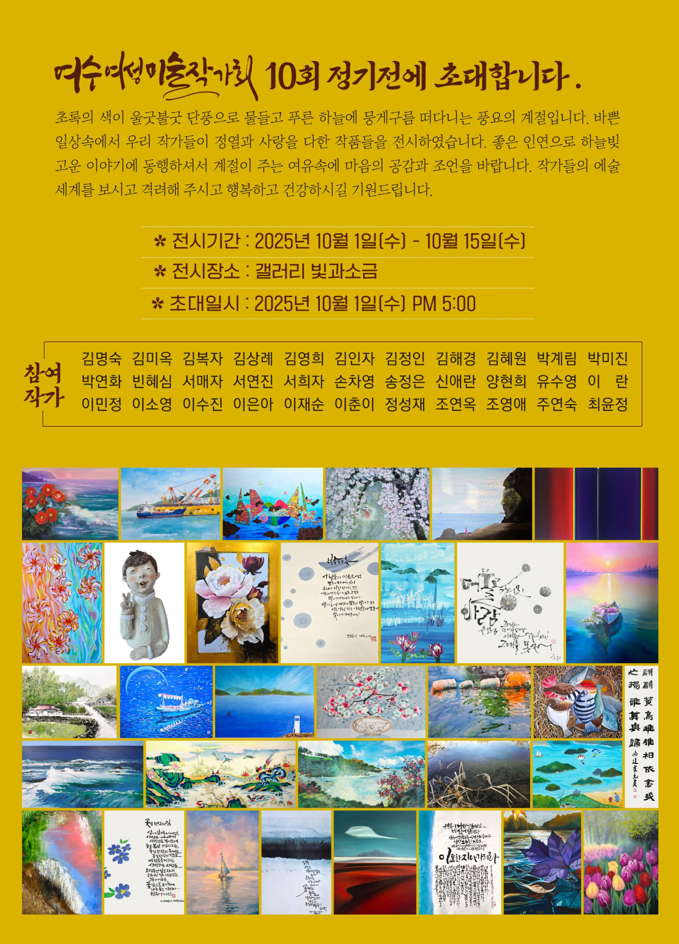 여수시의회는 지난 2021년부터 의회 로비를 활용해 작은갤러리 ‘공감뜨락’을 운영하며 서양화, 동양화, 사진, 캘리그래피 등 다양한 장르의 지역 예술작품을 시민들에게 무료로 공개해 왔다. 여러 작가들이 참여할 수 있도록 전시 기간은 보통 14일 이내로 제한되지만, 가을 문화 시즌을 맞아 이번 초대전은 특별히 한 달간 진행된다.